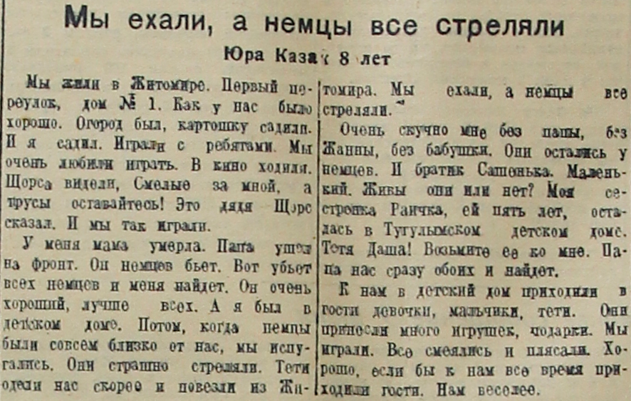 У меня мама умерла. Папа ушел на фронт. Он немцев бьет. Вот убьет всех немцев и меня найдет. Он очень хороший, лучше всех. А я был в детском доме. Потом, когда немцы были совсем близко от нас, мы испугались. Они страшно стреляли. Тети одели нас скорее и повезли из Житомира. Мы ехали, а немцы все стреляли.