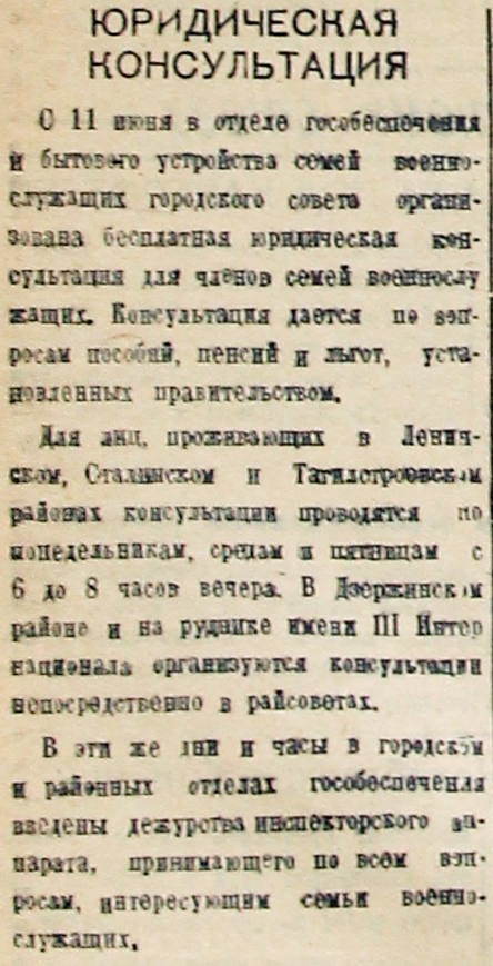 Для лиц, проживающих в Ленинском, Сталинском и Тагилстроевском районах консультации проводятся по понедельникам, средам и пятницам с 6 до 8 часов вечера. В Дзержинском районе и на руднике имени III Интернационала организуются консультации непосредственно в райсоветах.