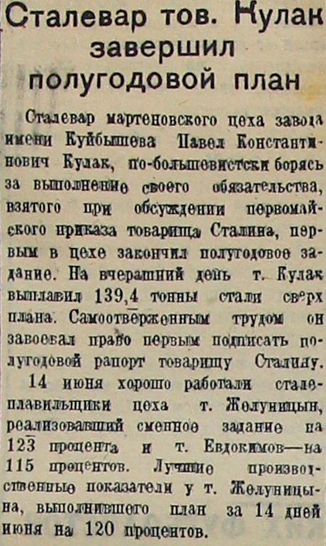 Сталевар мартеновского цеха завода имени Куйбышева Павел Константинович Кулак, по-большевистски борясь за выполнение своего обязательства, взятого при обсуждении первомайского приказа товарища Сталина, первым в цехе закончил полугодовое задание. На вчерашний день т. Кулак выплавил 139, 4 тонны стали сверх плана. Самоотверженным трудом он завоевал право первым подписать полугодовой рапорт товарищу Сталину.