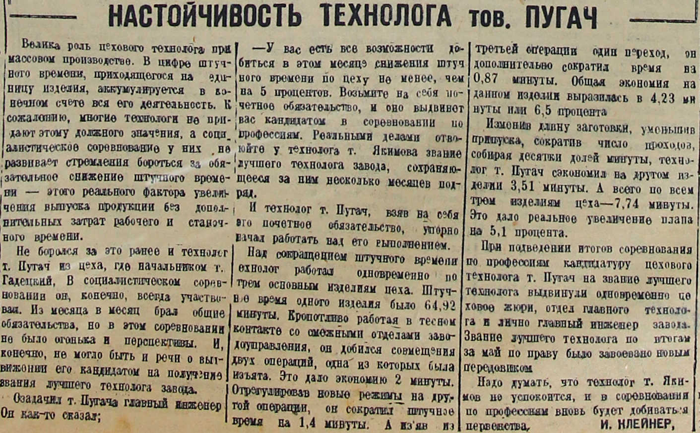 Не боролся за это ранее и технолог т. Пугач из цеха, где начальником т. Гадецкий. В социалистическом соревновании он, конечно, всегда участвовал. Из месяца в месяц брал общие обязательства, но в этом соревновании не было огонька и перспективы. И, конечно, не могло быть и речи о выдвижении его кандидатом на получение звания лучшего технолога завода.