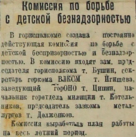В горисполкоме создана постоянно действующая комиссия по борьбе с детской беспризорностью и безнадзорностью. В комиссию входят зам. председателя горисполкома т. Бушин, секретарь горкома ВЛКСМ т. Игишева, заведующий горОНО т. Ципин, начальник горотдела милиции т. Котельников, председатель завкома металлургов т. Долженков.