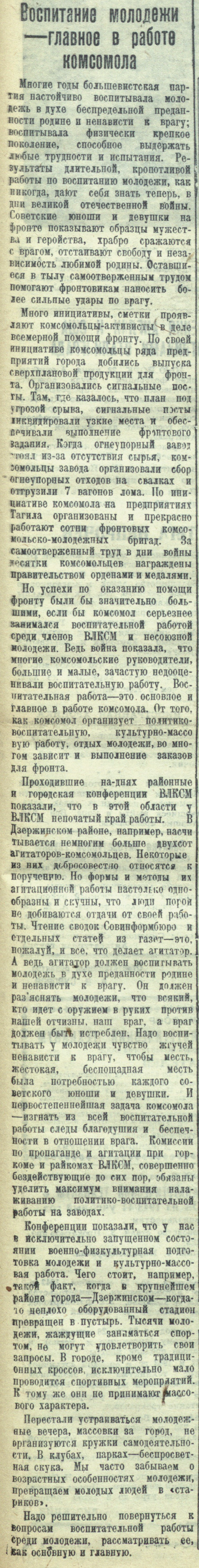Много инициативы, сметки проявляют комсомольцы-активисты в деле всемерной помощи фронту. По своей инициативе комсомольцы ряда предприятий города добились выпуска сверхплановой продукции для фронта. Организовались сигнальные посты. Там, где казалось, что план под угрозой срыва, сигнальные посты ликвидировали узкие места и обеспечивали выполнение фронтового задания. Когда огнеупорный завод стоял из-за отсутствия сырья, комсомольцы завода организовали сбор огнеупорных отходов на свалках и отгрузили 7 тонн вагонов лома. По инициативе комсомола на предприятиях Тагила организованы и прекрасно работают сотни фронтовых комсомольско-молодежных бригад. За самоотверженный труд в дни войны десятки комсомольцев награждены правительством орденами и медалями.