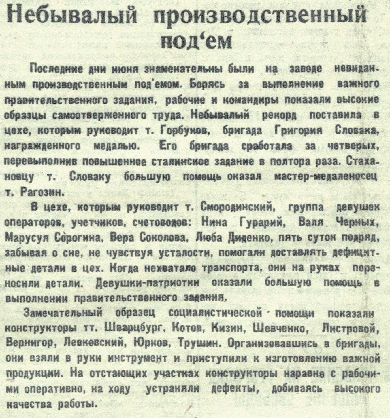 Последние дни июня знаменательны были на заводе невиданным производственным подъемом. Борясь за выполнение важного правительственного задания, рабочие и командиры показали высокие образцы самоотверженного труда. Небывалый рекорд поставила в цехе, которым руководит т. Горбунов, бригада Григория Словака, награжденного медалью. Его бригада сработала за четверых, перевыполнив повышенное сталинское задание в полтора раза. Стахановцу т. Словаку большую помощь оказал мастер-медаленосец т. Рагозин.