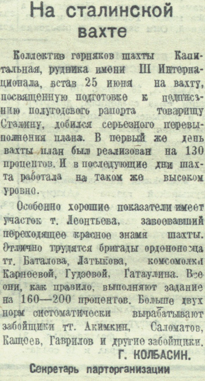 Коллектив горняков шахты Капитальная, рудника имени III Интернационала, встав 25 июня на вахту, посвященную подготовке к подписанию полугодового рапорта товарищу Сталину, добился серьезного перевыполнения плана. В первый же день вахты план был реализован на 130 процентов. И в последующие дни шахта работала на таком же высоком уровне.