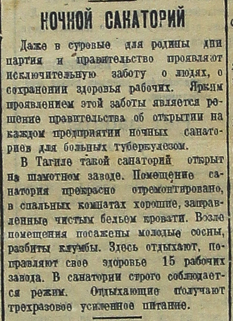 В Тагиле такой санаторий открыт на шамотном заводе. Помещение санатория прекрасно отремонтировано, в спальных комнатах хорошие, заправленные чистым бельем кровати. Возле помещения посажены молодые сосны, разбиты клумбы. Здесь отдыхают, поправляют свое здоровье 15 рабочих завода. В санатории строго соблюдается режим. Отдыхающие получают трехразовое усиленное питание.