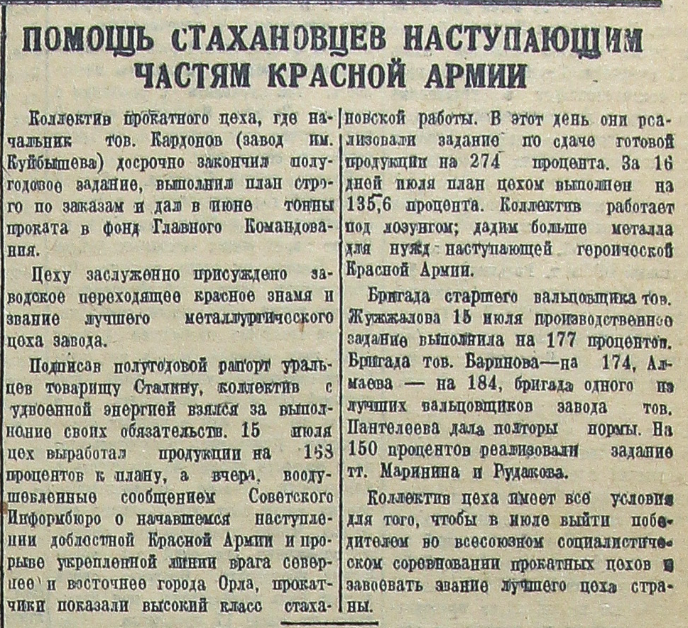 Подписав полугодовой рапорт уральцев товарищу Сталину, коллектив с удвоенной энергией взялся за выполнение своих обязательств. 15 июля цех выработал продукции на 168 процентов к плану, а вчера, воодушевленные сообщением Советского Информбюро о начавшемся наступлении доблестной Красной Армии и прорыве укрепленной линии врага севернее и восточнее города Орла, прокатчики показали высокий класс стахановской работы. В этот день они реализовали задание по сдаче готовой продукции на 274 процента. За 16 дней июля план цехом выполнен на 135,6 процента. Коллектив работает под лозунгом; дадим больше металла для нужд наступающей героической Красной Армии.