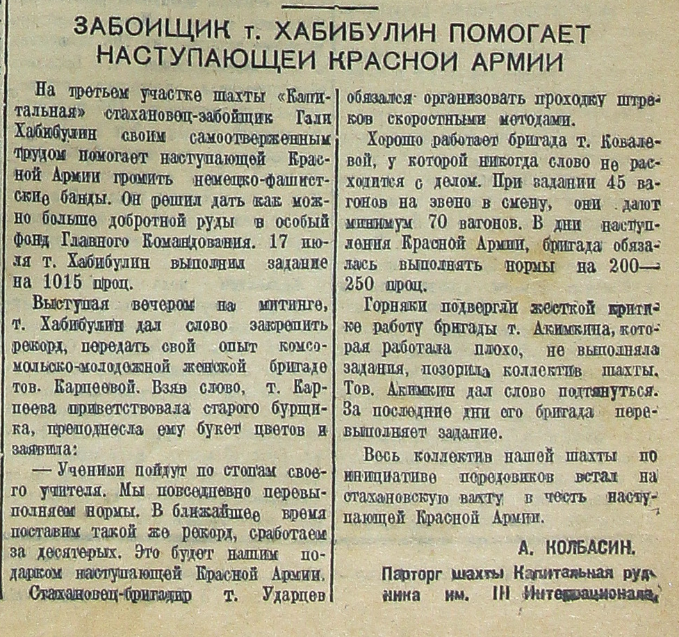 На третьем участке шахты «Капитальная» стахановец-забойщик Гали Хабибулин своим самоотверженным трудом помогает наступающей Красной Армии громить немецко-фашистские банды. Он решил дать как можно больше добротной руды в особый фонд Главного Командования. 17 июля т. Хабибулин выполнил задание на 1015 проц.