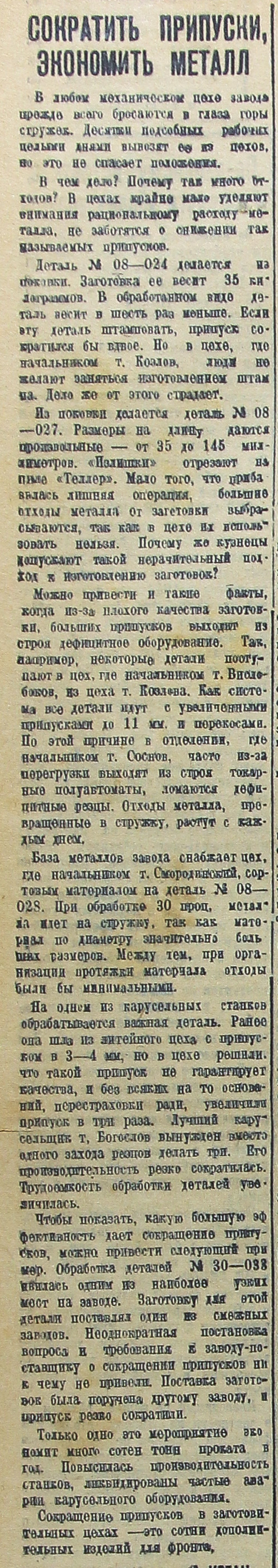 Можно привести и такие факты, когда из-за плохого качества заготовки, больших припусков выходит из строя дефицитное оборудование. Так, например, некоторые детали поступают в цех, где начальником т. Вислобоков, из цеха т. Козлова. Как система все детали идут с увеличенными припусками до 11 мм. и перекосами. По этой причине в отделении, где начальником т. Соснов, часто из-за перегрузки выходят из строя токарные полуавтоматы, ломаются дефицитные резцы. Отходы металла, превращенные в стружку, растут с каждым днем.