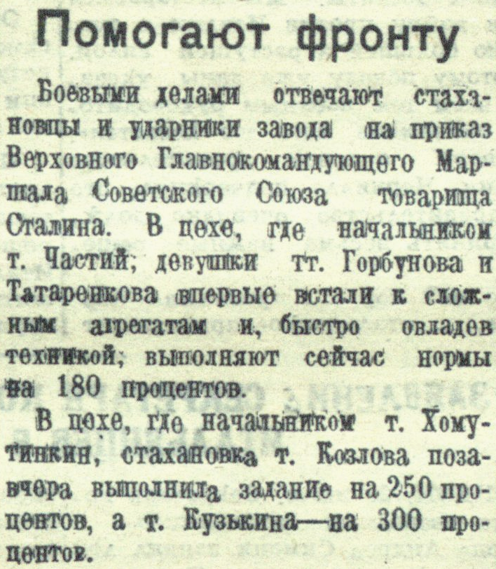 Боевыми делами отвечают стахановцы и ударники завода на приказ Верховного Главнокомандующего Маршала Советского Союза товарища Сталина. В цехе, где начальником т. Частий, девушки тт. Горбунова и Татарникова впервые встали к сложным агрегатам и, быстро овладев техникой, выполняют сейчас нормы на 180 процентов.