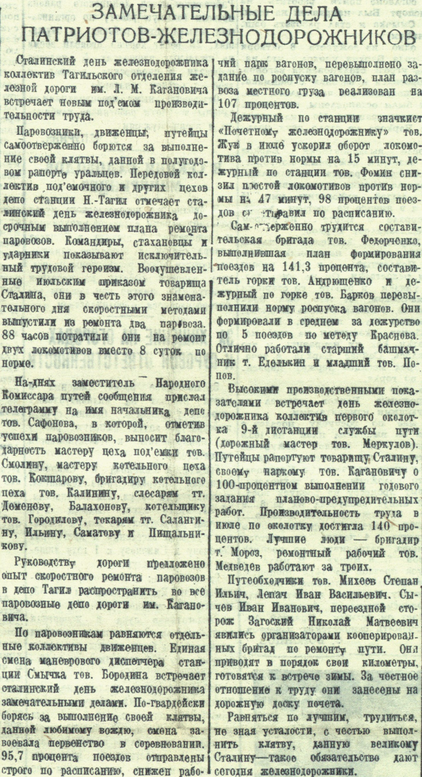 Паровозники, движенцы; путейцы самоотверженно борются за выполнение своей клятвы, данной в полугодовом рапорте уральцев. Передовой коллектив подъемочного и других цехов депо станции Н.-Тагил отмечает сталинский день железнодорожника досрочным выполнением плана ремонта паровозов. Командиры, стахановцы и ударники показывают исключительный трудовой героизм. Воодушевленные июльским триказом товарища Сталина, они в честь этого знаменательного дня скоростными методами выпустили из ремонта два паровоза. 88 часов потратили они на ремонт двух локомотивов вместо 8 суток по норме.