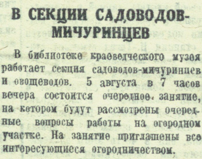 В библиотеке краеведческого музея работает секция садоводов-мичуринцев и овощеводов. 5 августа в 7 часов вечера состоится очередное, занятие, на котором будут рассмотрены очередные вопросы работы на огородном участке. На занятие приглашены все интересующиеся огородничеством.