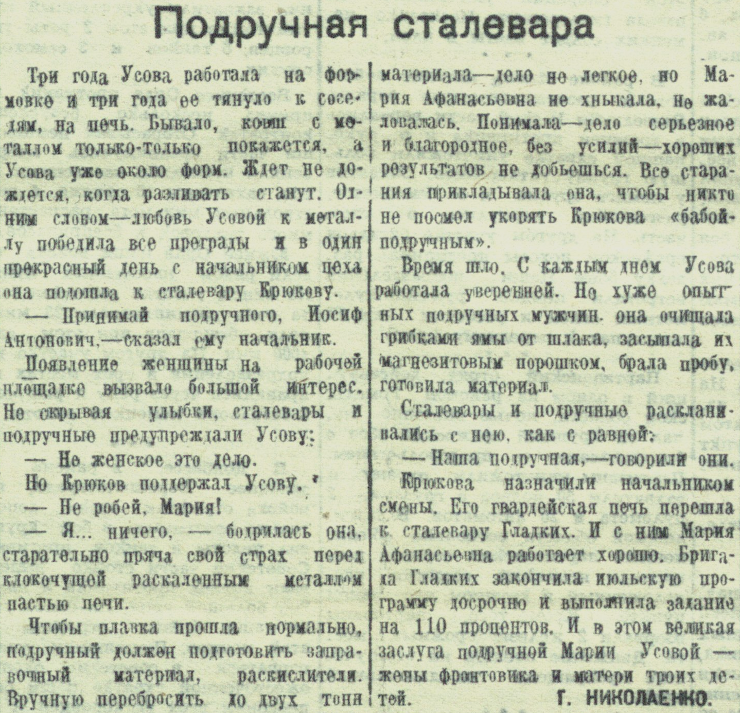 Крюкова назначили начальником смены. Его гвардейская печь перешла к сталевару Гладких. И с ним Мария Афанасьевна работает хорошо. Бригада Гладких закончила июльскую программу досрочно и выполнила задание на 110 процентов. И в этом великая заслуга подручной Марии Усовой – жены фронтовика и матери троих детей.