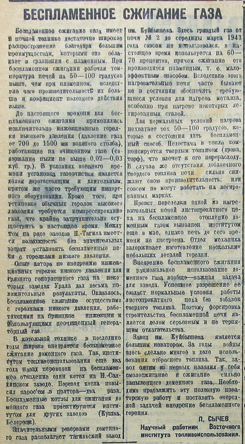Завод им. Куйбышева является большим новатором. За годы войны здесь сделано многое в дело использования отбросного топлива. Так, завод одним из первых наладил у себя смолосжигание и сжигание сильно запыленного доменного газа. Необходимо продолжить эту полезную новаторскую работу и поставить очередной задачей внедрение беспламенного горения.