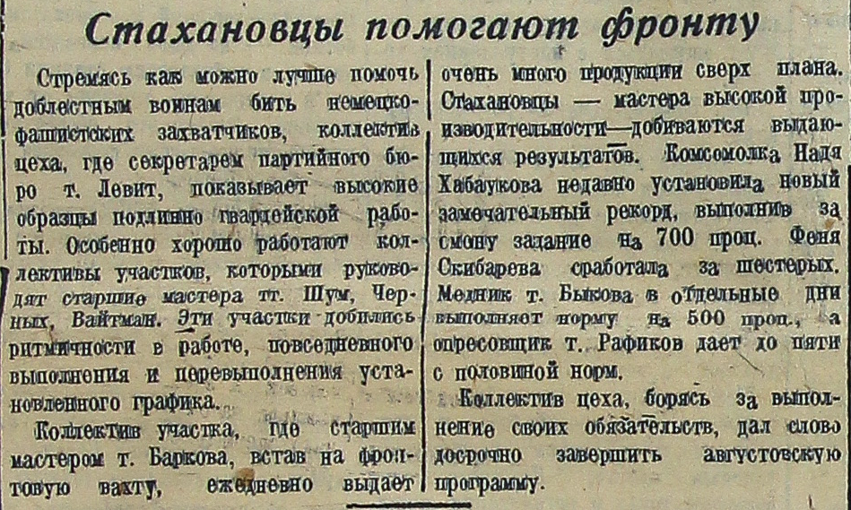 Стремясь как можно лучше помочь доблестным воинам бить немецко- фашистских захватчиков, коллектив цеха, где секретарем партийного бюро т. Левит, показывает высокие образцы подлинно гвардейской работы. Особенно хорошо работают коллективы участков, которыми руководят старшие мастера тт. Шум, Черных, Вайтман. Эти участки добились ритмичности в работе, повседневного выполнения и перевыполнения установленного графика.