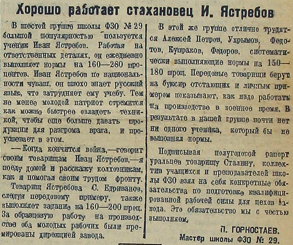 В шестой группе школы ФЗО №29 большой популярностью пользуется ученик Иван Ястребов. Работая на ответственных деталях, он ежедневно выполняет нормы на 160-280 процентов. Иван Ястребов по национальности чуваш, он плохо знает русский язык, что затрудняет ему учебу. Тем не менее молодой патриот стремится как можно быстрее овладеть техникой, чтобы еще больше давать продукции для разгрома врага, и преуспевает в этом.