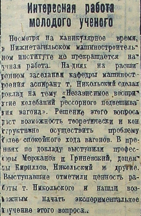 Несмотря на каникулярное время, в Нижнетагильском машиностроительном институте не прекращается научная работа. На-днях на расширенном заседании кафедры машиностроения аспирант т. Никольский сделал доклад на тему «Независимое восприятие колебаний рессорного подвешивания вагона». Решение этого вопроса даст возможность теоретически и конструктивно осуществить проблему болеe спокойного хода вагонов. В прениях по докладу выступили профессоры Мержанов и Греневский, доценты Кириллов, Никольский и другие. Выступавшие отметили ценность работы т. Никольского и нашли возможным начать экспериментальное учение этого вопроса.