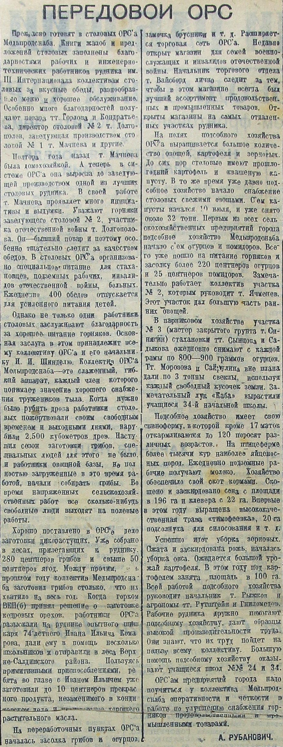 Однако не только одни работники столовых заслуживают благодарность за хорошее питание горняков. Основная заслуга в этом принадлежит всему коллективу ОРС'а и его начальнику Н. Я. Шинделю. Коллектив ОРС'а Медьпродснаба – это слаженный, гибкий аппарат, каждый член которого понимает значение хорошего снабжения тружеников тыла. Когда нужно было рубить дрова работники столовых пожертвовали своим свободным временем и выходными днями, нарубили 2.500 кубометров дров. Наступил сезон заготовки грибов, специальных людей для этого не было, и работники овощной базы, не полностью загруженные в это время работой, начали собирать грибы. Во время напряженных сельскохозяйственных работ все сколько-нибудь свободные люди выходят на полевые работы.
