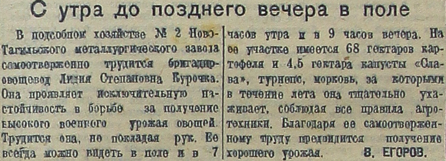 В подсобном хозяйстве № 2 Ново-Тагильского металлургического завода самоотверженно трудится бригадир-овощевод Лидия Степановна Курочка. Она проявляет исключительную настойчивость в борьбе за получение высокого военного урожая овощей. Трудится она, не покладая рук. Ее всегда можно видеть в поле и в 7 часов утра и в 9 часов вечера. На ее участке имеется 68 гектаров картофеля и 4,6 гектара капусты «Слава», турнепс, морковь, за которыми в течение лета она тщательно ухаживает, соблюдая все правила агротехники. Благодаря ее самоотверженному труду предвидится получение хорошего урожая.