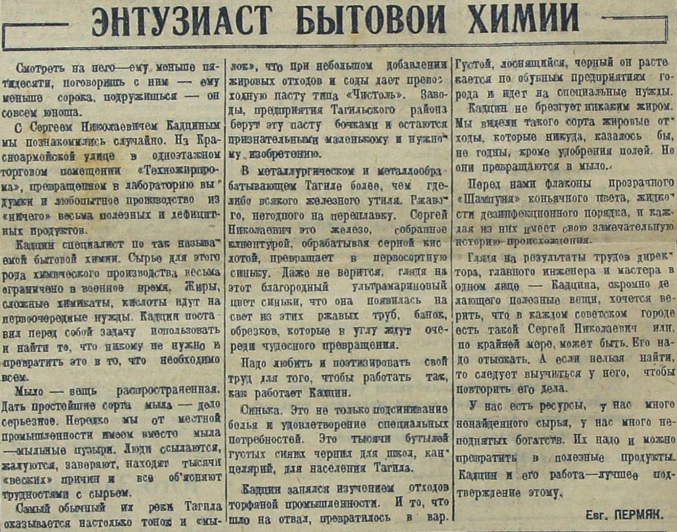 Самый обычный ил реки Тагила оказывается настолько тонок и «мылок», что при небольшом добавлении жировых отходов и соды дает превосходную пасту типа «Чистоль». Заводы, предприятия Тагильского района берут эту пасту бочками и остаются признательными маленькому и нужному изобретению.