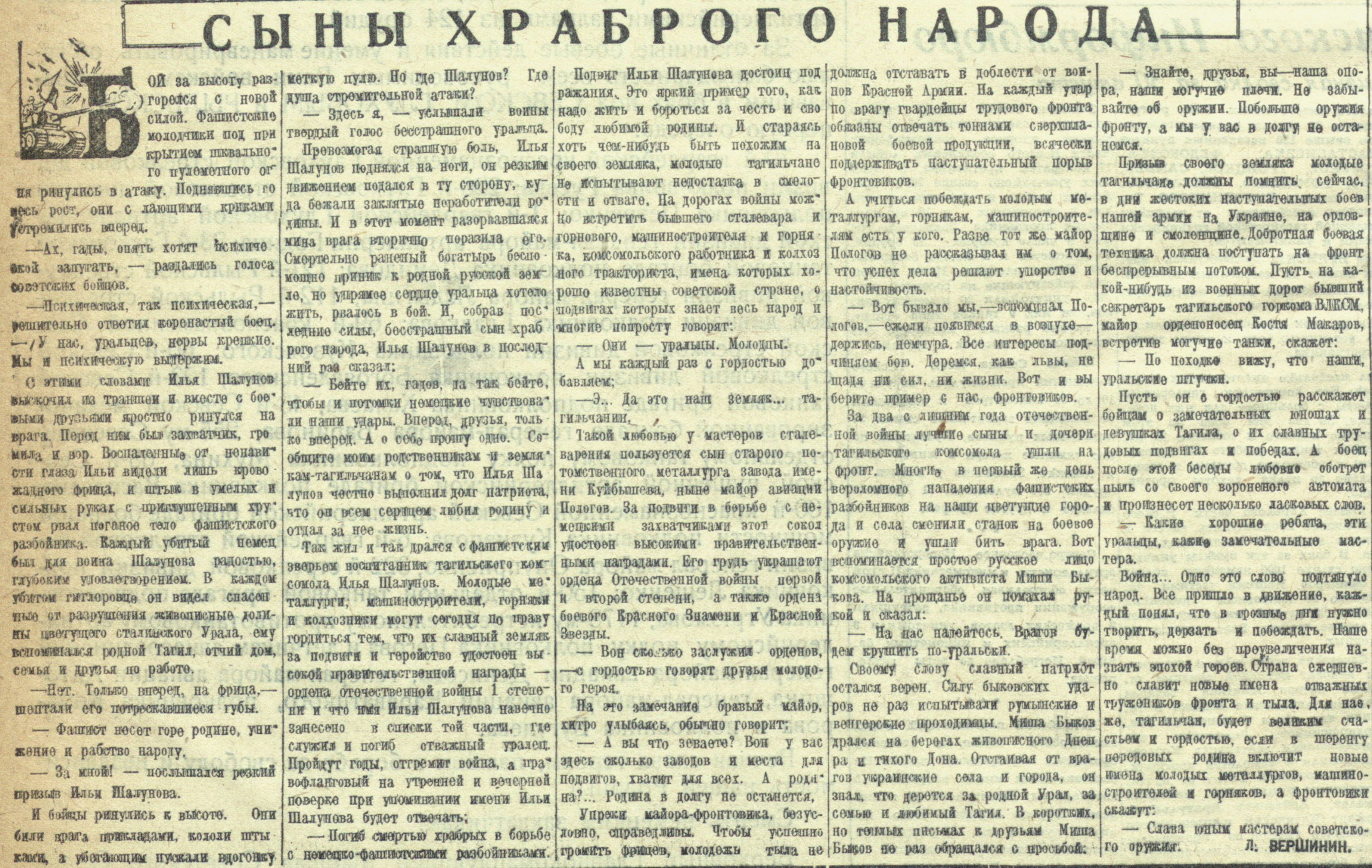 Война... Одно это слово подтянуло народ. Все пришло в движение, каждый понял, что в грозные дни нужно творить, дерзать и побеждать. Наше время можно без преувеличения назвать эпохой героев. Страна ежедневно славит новые имена отважных тружеников фронта и тыла. Для нас же, тагильчан, будет великим счастьем и гордостью, если в шеренгу передовых родина включит новые имена молодых металлургов, машиностроителей и горняков, а фронтовики скажут:
