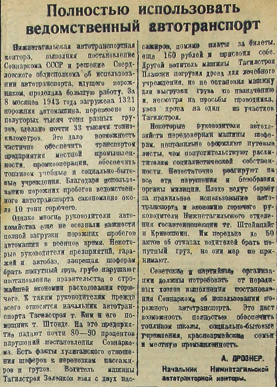 Нижнетагильская автотранспортная контора, выполняя постановление Совнаркома СССР и решение Свердловского облисполкома об использовании автотранспорта, идущего порожняком, проделала большую работу. За 8 месяцев 1943 года загружена 1321 порожняя автомашина, перевезено 10 полуторных тысяч тонн разных грузов, сделано почти 33 тысячи тонно-километров. Это дало возможность частично обеспечить транспортом предприятия местной промышленности, промкооперации, обеспечить топливом учебные и социально-бытовые учреждения. Благодаря использованию порожних пробегов ведомственного автотранспорта сэкономлено около 10 тони горючего.