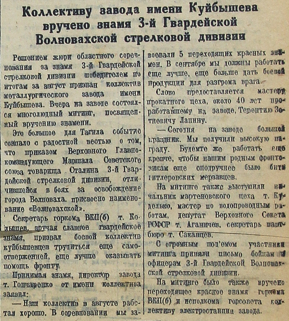 Это большое для Тагила событие совпало с радостной вестью о том, что приказом Верховного Главнокомандующего Маршала Советского союза товарища Сталина 3-й Гвардейской стрелковой дивизии, отличившейся в боях за освобождение города Волноваха, присвоено наименование «Волновахской».