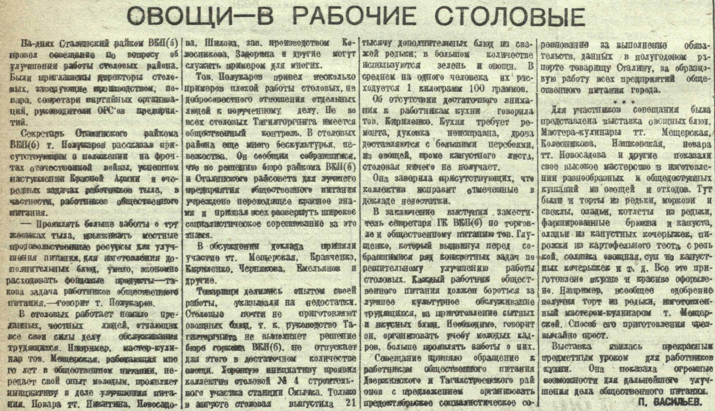 На-днях Сталинский райком ВКП(б) провел совещание по вопросу об улучшении работы столовых района. Были приглашены директоры столовых, заведующие производством, повара, секретари партийных организации, руководители ОРСов предприятий.