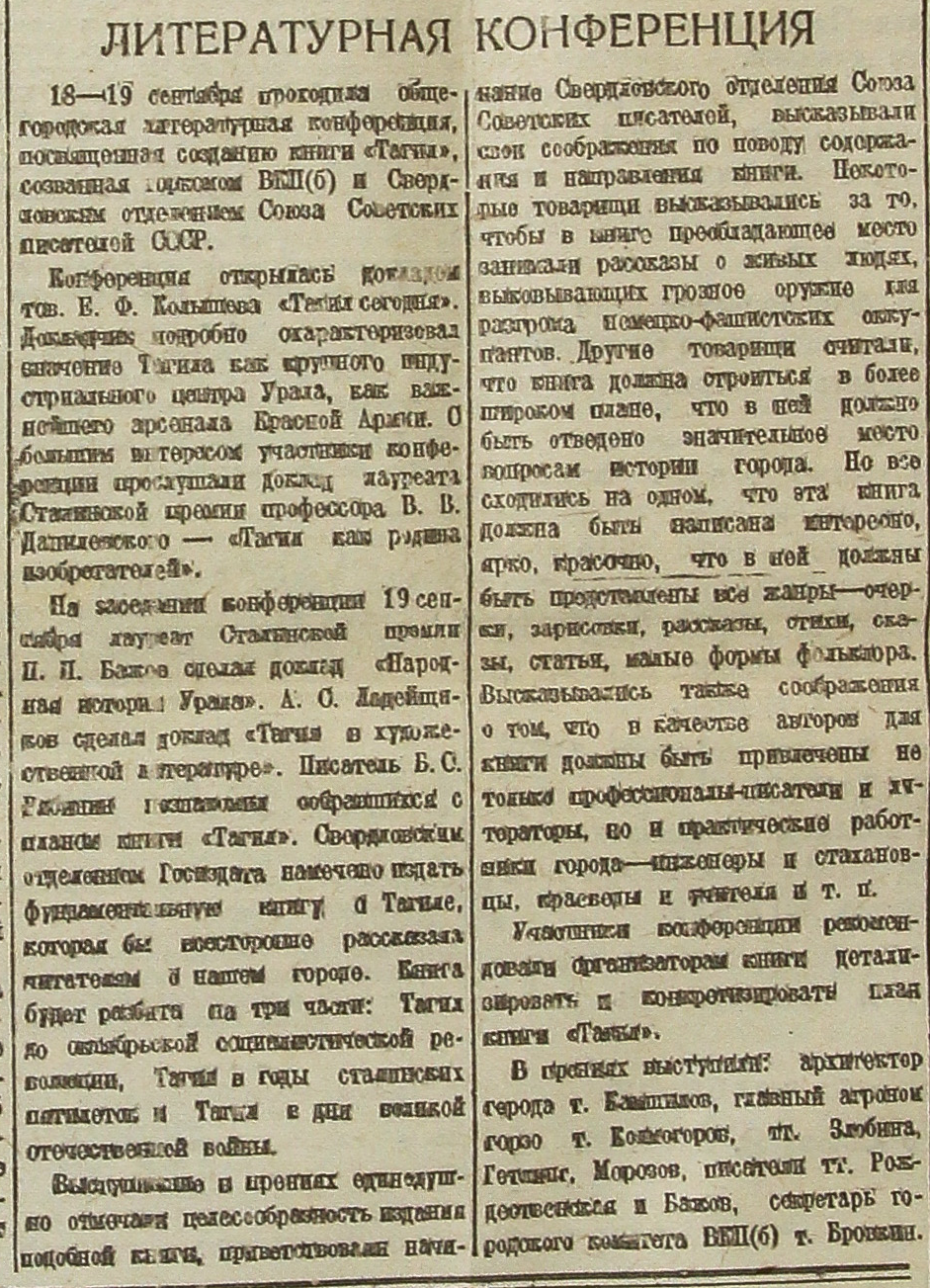 На заседании конференции 19 сентября лауреат Сталинской премии П.П. Бажов сделал доклад «Народная история Урала». А.С. Ладейщиков сделал доклад «Тагил в художественной литературе». Писатель Б.С. Рябинин познакомил собравшихся с планом книги «Тагил». Свердловским отделением Госиздата намечено издать фундаментальную книгу о Тагиле, которая бы всесторонне рассказала читателям о нашем городе. Книга будет разбита на три части: Тагил до октябрьской социалистической революции, Тагил в годы сталинских пятилеток и Тагил в дни великой отечественной войны.