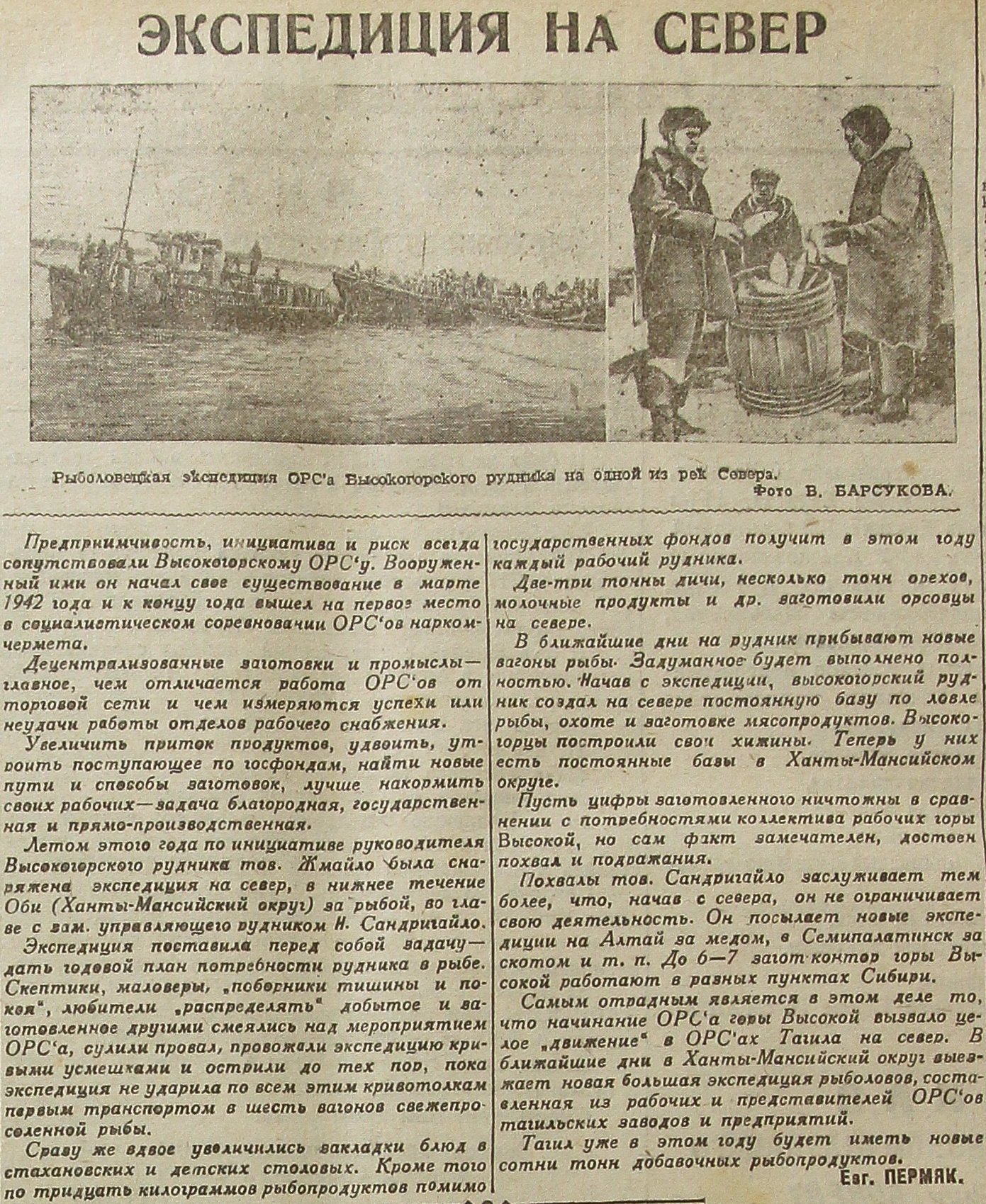 Летом этого года по инициативе руководителя Высокогорского рудника тов. Жмайло была снаряжена экспедиция на север, в нижнее течение Оби (Ханты-Мансийский округ) за рыбой, во главе с зам. управляющего рудником И. Сандригайло.