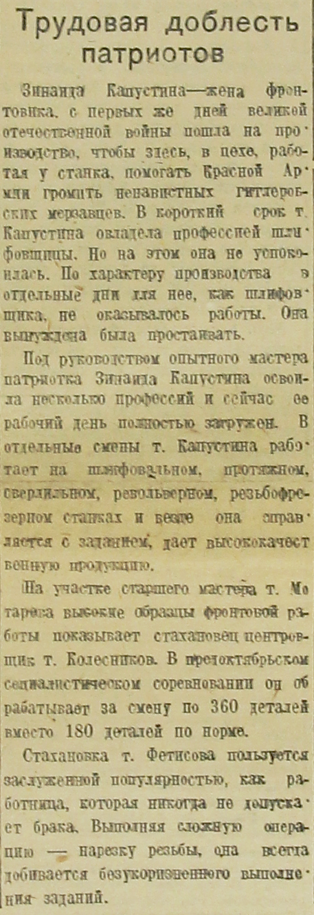 Зинаида Капустина – жена фронтовика, с первых же дней великой отечественной войны пошла на производство, чтобы здесь, в цехе, работая у станка, помогать Красной Армии громить ненавистных гитлеровских мерзавцев. В короткий срок т. Капустина овладела профессией шлифовщицы. Но на этом она не успокоилась. По характеру производства в отдельные дни для нее, как шлифовщика, не оказывалось работы. Она вынуждена была простаивать.