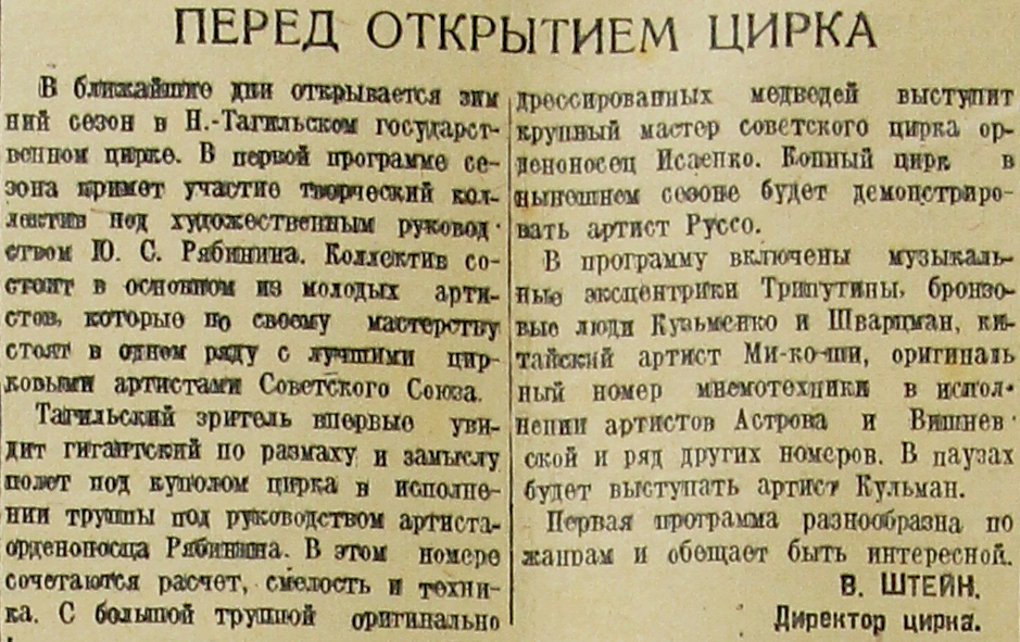 В ближайшие дни открывается зимний сезон в Н.-Тагильском государственном цирке. В первой программе сезона примет участие творческий коллектив под художественным руководством Ю. С. Рябинина. Коллектив состоит в основном из молодых артистов, которые по своему мастерству стоят в одном ряду с лучшими цирковыми артистами Советского Союза.