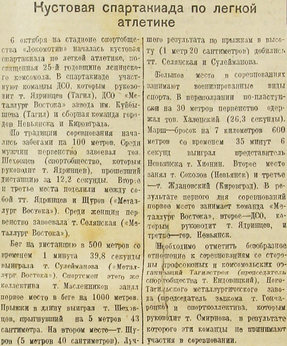 С октября на стадионе спортобщества «Локомотив» началась кустовая спартакиада по легкой атлетике, посвященная 25-й годовщине ленинского комсомола. В спартакиаде участвуют команды ДСО, которым руководит т. Ядринцев (Тагил), ДСО «Металлург Востока» завода им. Куйбышева (Тагил) и сборная команда городов Невьянска и Кировграда.