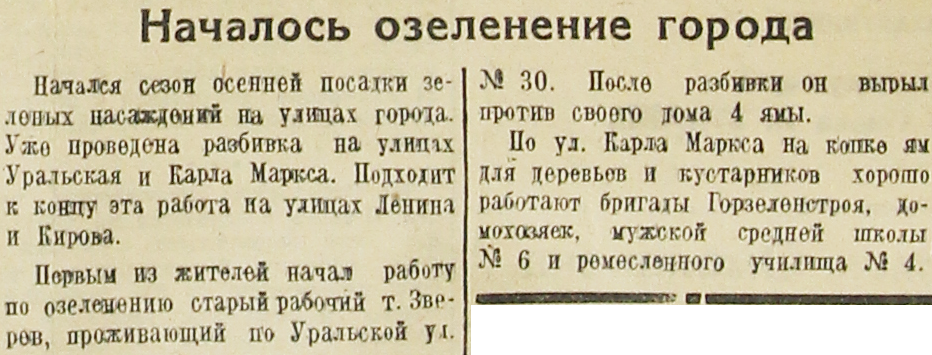 Первым из жителей начал работу по озеленению старый рабочий т. Зверев, проживающий по Уральской yл. № 30. После разбивки он вырыл против своего дома 4 ямы.