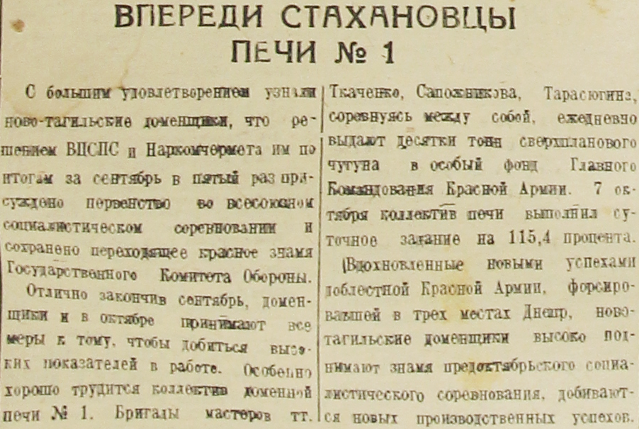 Вдохновленные новыми успехами доблестной Красной Армии, форсировавшей в трех местах Днепр, новотагильские доменщики высоко поднимают знамя предоктябрьского социалистического соревнования, добиваются новых производственных успехов.