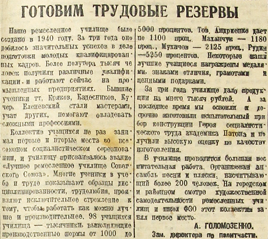 Наше ремесленное училище было создано в 1940 году. За три года оно добилось значительных успехов в деле подготовки молодых квалифицированных кадров. Более полутора тысяч человек получили различные квалификации и работают сейчас на промышленных предприятиях. Бывшие ученики тт. Кряков, Кадесников, Кучер, Еленевский стали мастерами, учат других, помогают овладевать сложными профессиями.