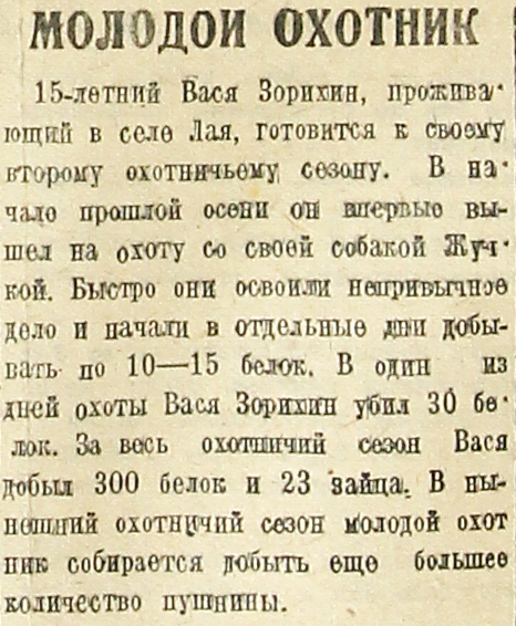 15-летний Вася Зорихин, проживающий в селе Лая, готовится к своему второму охотничьему сезону. В начале прошлой осени он впервые вышел на охоту со своей собакой Жучкой. Быстро они освоили непривычное дело и начали в отдельные дни добывать по 10-15 белок. В один из дней охоты Вася Зорихин убил 30 белок. За весь охотничий сезон Вася добыл 300 белок и 23 зайца. В нынешний охотничий сезон молодой охотник собирается добыть еще большее количество пушнины.