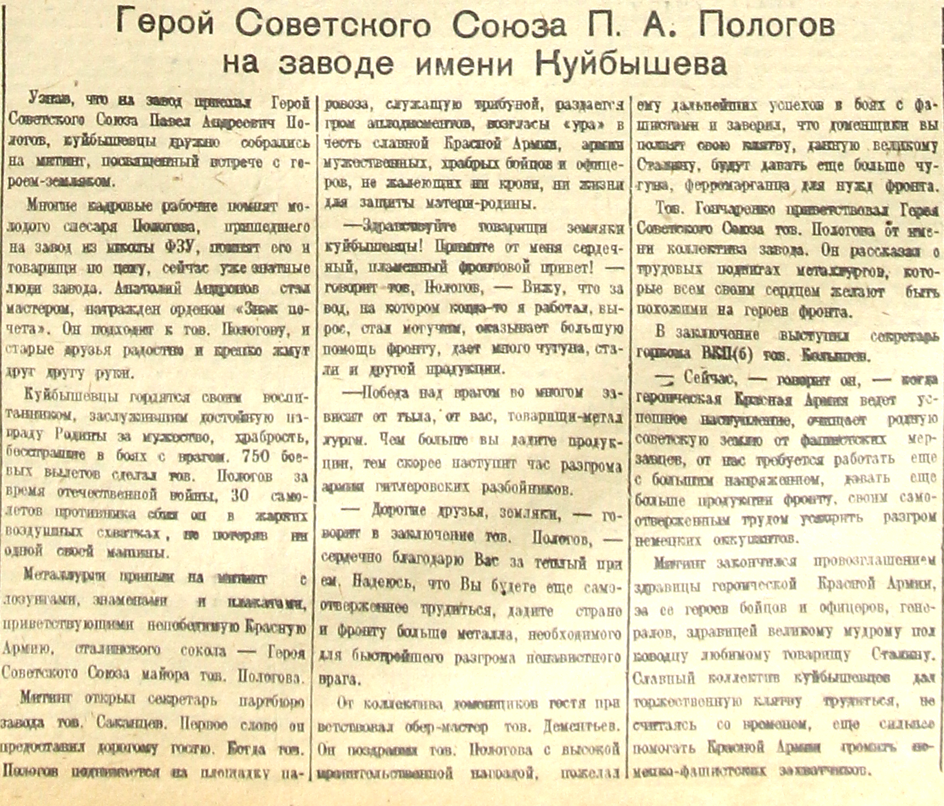 – Здравствуйте товарищи земляки куйбышенцы! Примите от меня сердечный, пламенный фронтовой привет! – говорит тов. Пологов, – Вижу, что завод., на котором когда-то я работал, вырос, стал могучим, оказывает большую помощь фронту, дает много чугуна, стали и другой продукции.