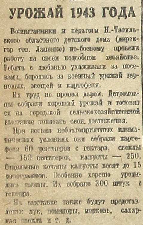 Воспитанники и педагоги Н.-Тагильского областного детского дома (директор тов. Лапенко) по-боевому провели работу на своем подсобном хозяйстве. Ребята с любовью ухаживали за посевами, боролись за военный урожай зерновых, овощей и картофеля.