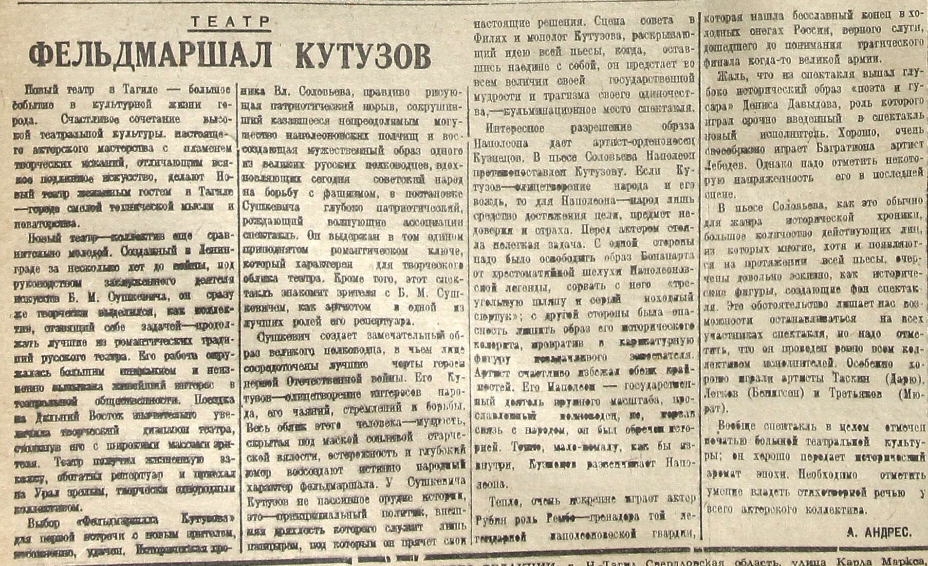 Выбор «Фельдмаршала Кутузова» для первой встречи с новым зрителем, несомненно, удачен. Историческая хроника Вл. Соловьева, правдиво рисующая патриотический порыв, сокрушивший казавшееся непреодолимым могущество наполеоновских полчищ и воссоздающая мужественный образ одного из великих русских полководцев, вдохновляющих сегодня советский народ на борьбу с фашизмом, в постановке Сушкевича глубоко патриотический, рождающий волнующие ассоциации спектакль. Он выдержан в том едином приподнятом романтическом ключе, который характерен для творческого облика театра. Кроме того, этот спектакль знакомит зрителя с Б. М. Сушкевичем, как артистом в одной из лучших ролей его репертуара.