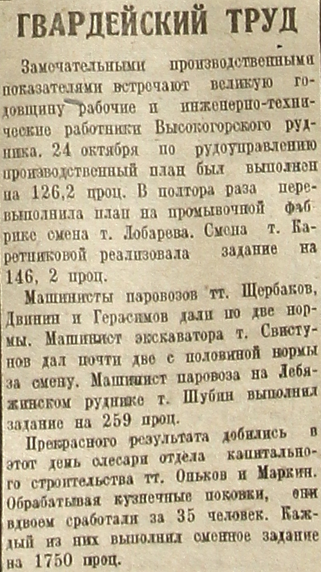 Машинисты паровозов тт. Щербаков, Двинин и Герасимов дали по две нормы. Машинист экскаватора т. Свистунов дал почти две с половиной нормы за смену. Машинист паровоза на Лебяжинском руднике т. Шубин выполнил задание на 259 проц.