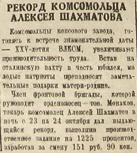 Член фронтовой бригады, которой руководит орденоносец тов. Монаков, токарь комсомолец Алексей Шахматов в ночь с 23 на 24 октября дал выдающийся рекорд, выполнив производственное задание на 1225 процентов, заработав за смену 151 руб. 90 коп.