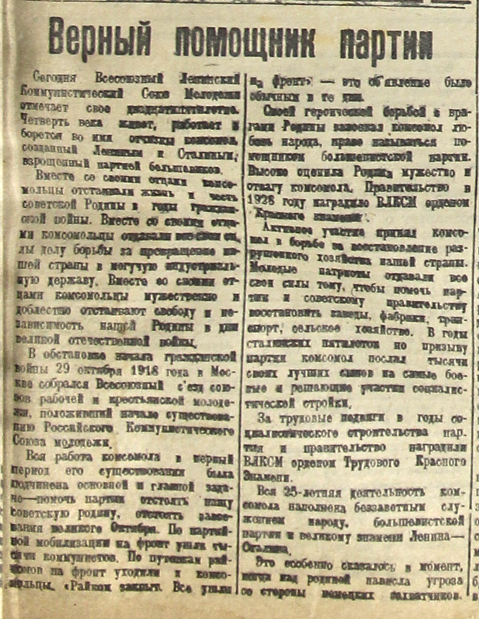 Вся 25-летняя деятельность комсомола наполнена беззаветным служением народу, большевистской партии и великому знамени Ленина – Сталина.