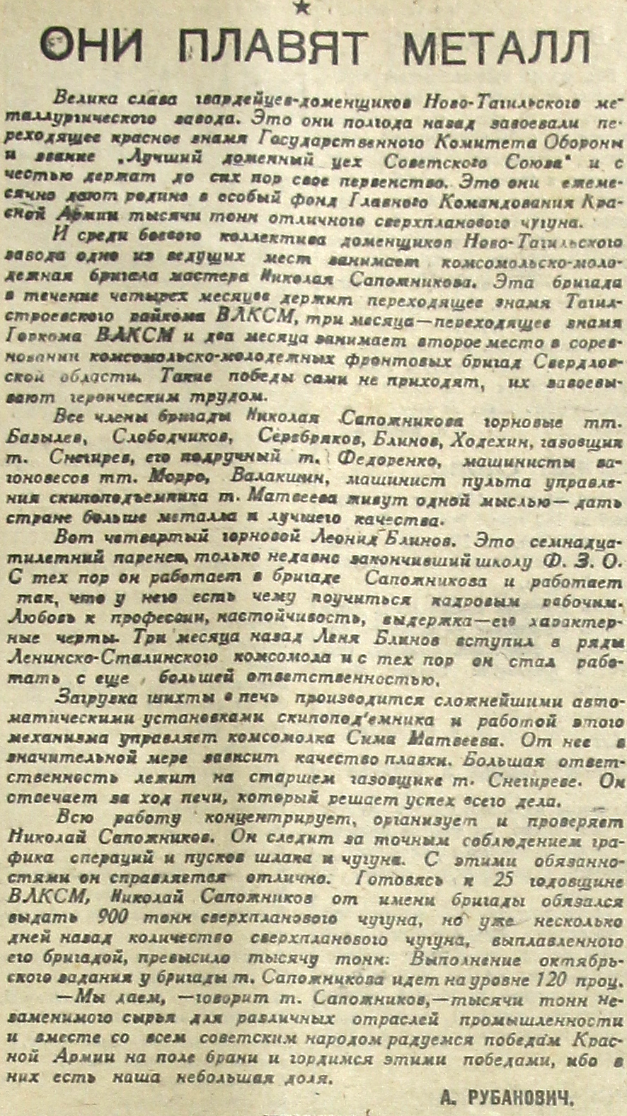 И среди боевого коллектива доменщиков Ново-Тагильского завода одно из ведущих мест занимает комсомольско-молодежная бригада мастера Николая Сапожникова. Эта бригада в течение четырех месяцев держит переходящее знамя Тагилстроевского района ВЛКСМ, три месяца – переходящее знамя Горкома ВЛКСМ и два месяца занимает второе место в соревновании комсомольско-молодежных фронтовых бригад Свердловской области. Такие победы сами не приходят, их завоевывают героическим трудом.