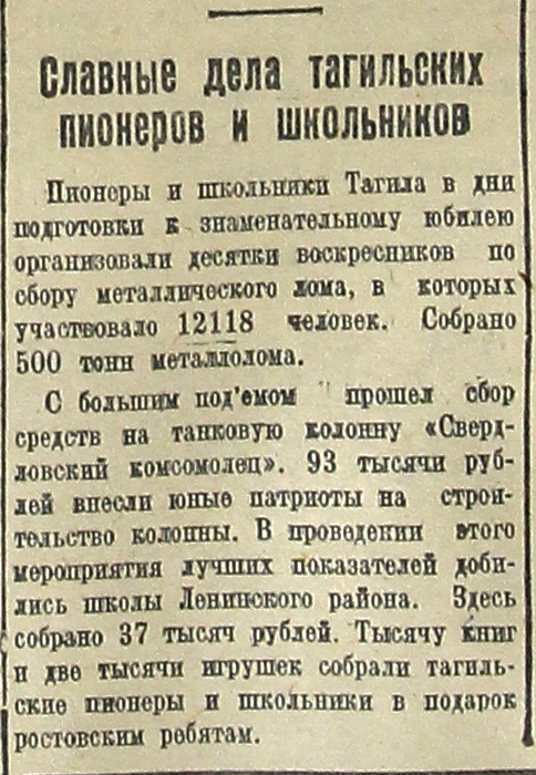 С большим подъемом прошел сбор средств на танковую колонну «Свердловский комсомолец». 93 тысячи рублей внесли юные патриоты на строительство колонны. В проведении этого мероприятия лучших показателей добились школы Ленинского района. Здесь собрано 37 тысяч рублей. Тысячу книг и две тысячи игрушек собрали тагильские пионеры и школьники в подарок ростовским ребятам.