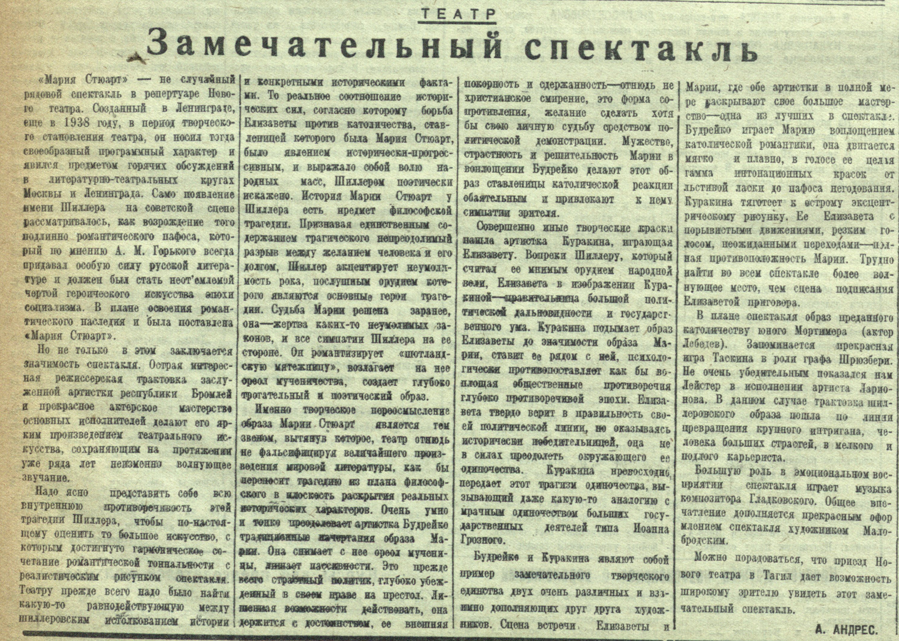 «Мария Стюарт» – не случайный рядовой спектакль в репертуаре Нового театра. Созданный в Ленинграде, еще в 1938 году, в период творческого становления театра, он носил тогда своеобразный программный характер и явился предметом горячих обсуждений в литературно-театральных кругах Москвы и Ленинграда. Само появление имени Шиллера на советской сцене рассматривалось, как возрождение того подлинно романтического пафоса, который по мнению А. М. Горького всегда придавал особую силу русской литературе и должен был стать неотъемлемой чертой героического искусства эпохи социализма. В плане освоения романтического наследия и была поставлена «Мария Стюарт».