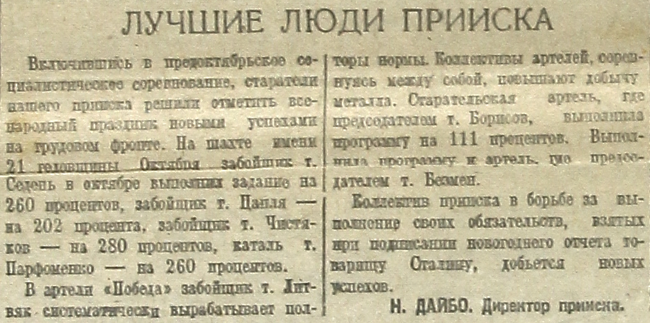 Включившись в предоктябрьское социалистическое соревнование, старатели нашего прииска решили отметить всенародный праздник новыми успехами на трудовом фронте. На шахте имени 21 годовщины октября забойщик т. Седень в октябре выполнил задание на 260 процентов, забойщик т. Цапля – на 202 процента, забойщик т. Чистяков – на 280 процентов, каталь т. Парфоменко – на 260 процентов.