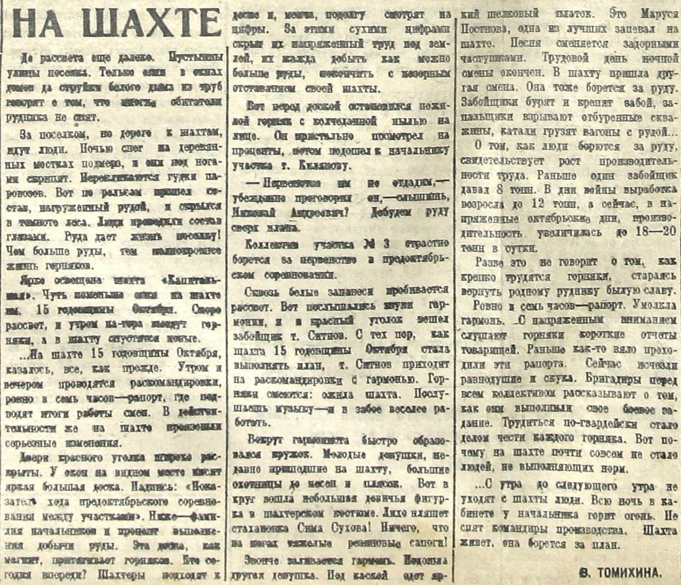 О том, как люди борются за руду, свидетельствует рост производительности труда. Раньше один забойщик давал 8 тонн. В дни войны выработка возросла до 12 тонн, а сейчас, в напряженные октябрьские дни, производительность увеличилась до 18-20 тонн в сутки.