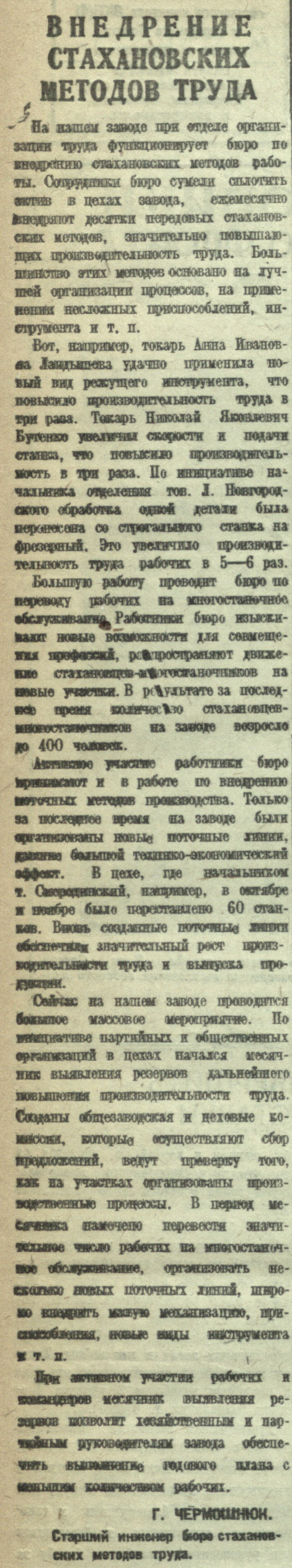 Г. ЧЕРМОШНЮК. Старший инженер бюро стахановских методов труда.
