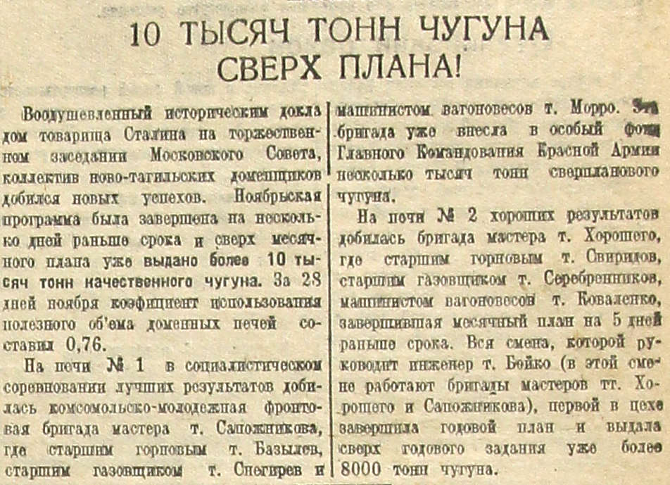 Воодушевленный историческим докладом товарища Сталина на торжественном заседании Московского Совета, коллектив ново-тагильских доменщиков добился новых успехов. Ноябрьская программа была завершена на несколько дней раньше срока и сверх месячного плана уже выдано более 10 тысяч тонн качественного чугуна. За 28 дней ноября коэфициент использования полезного объема доменных печей составил 0,76.