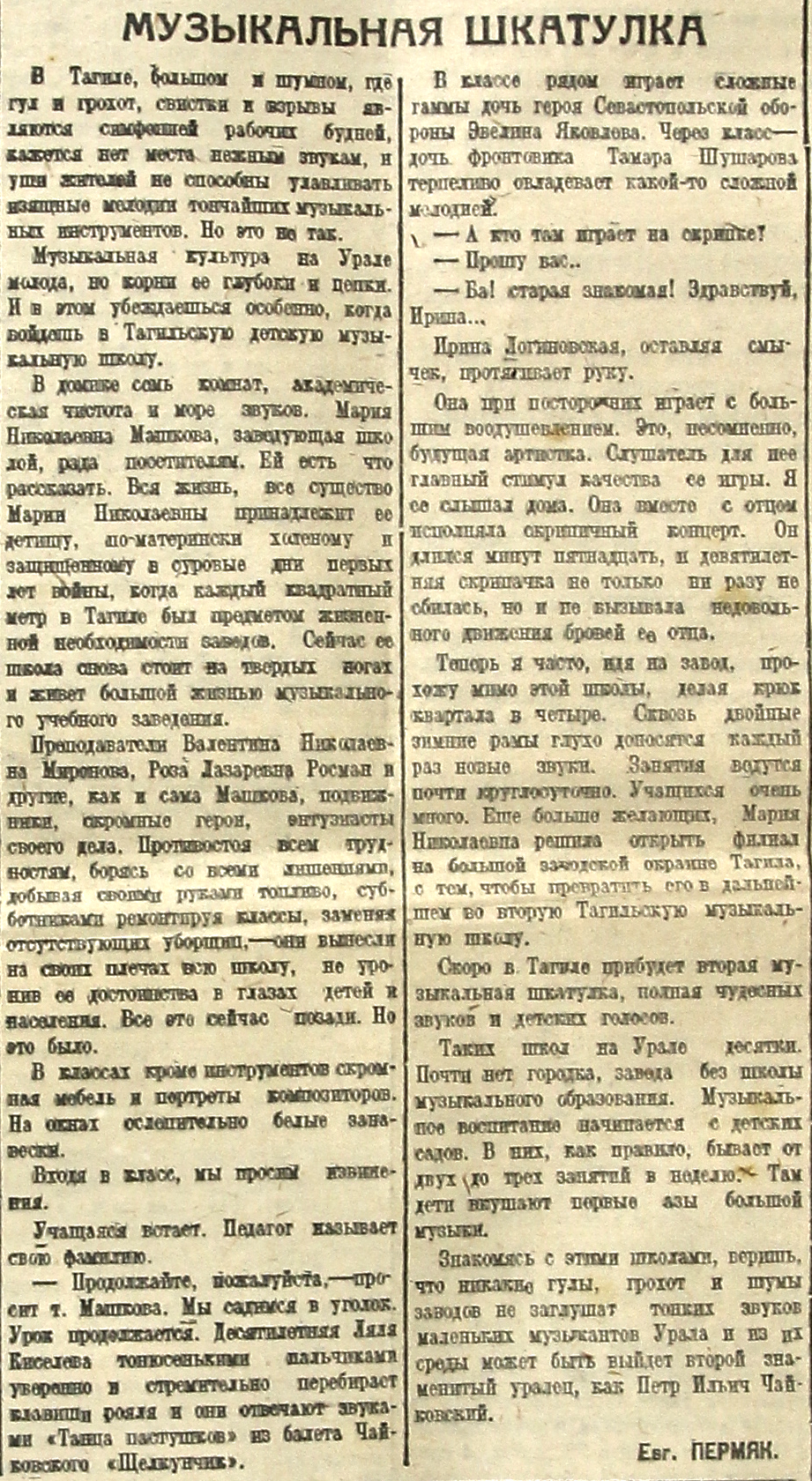 Знакомясь с этими школами, веришь, что никакие гулы, грохот и шумы заводов не заглушат тонких звуков маленьких музыкантов Урала и из их среды может быть выйдет второй знаменитый уралец, как Петр Ильич Чайковский.